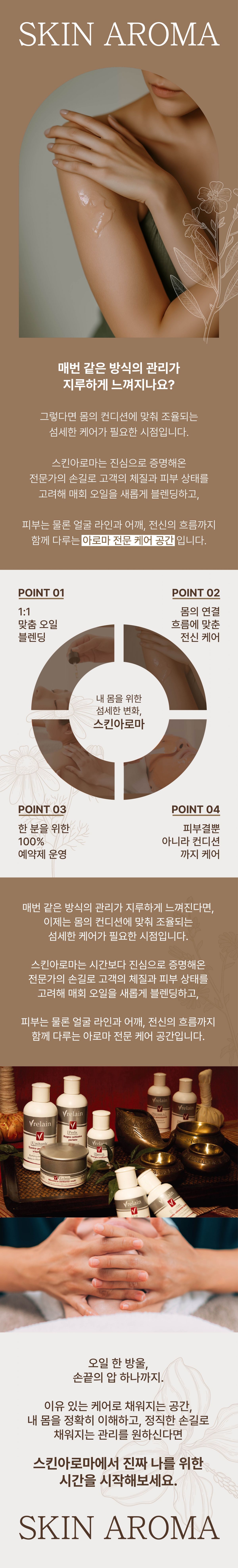 저희 스킨아로마는, 고객의 피부 상태와 체질에 맞춰 매회 오일을 새롭게 블렌딩하는 1:1 맞춤 아로마 케어 공간입니다.